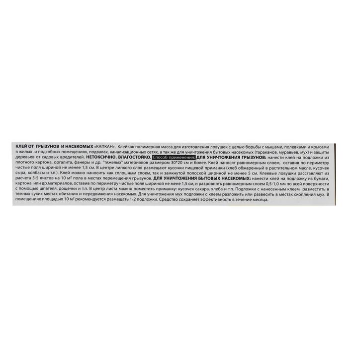 Для уничтожения грызунов: нанести клей на подложки из плотного картона, оргалита, фанеры и др. "тяжелых" материалов размером 30*20 см и более. Клей наносят равномерным слоем, оставив по периметру чистые поля шириной не менее 1,5 см. В центре липкого слоя размещают кусочки пищевой приманки (хлеб обжаренный в растительном масле, кусочек сыра, колбасы и т.п.). Клей можно наносить как сплошным слоем, так и замкнутой полоской шириной не менее 5 см. Клеевые ловушки расставляют из расчета 3-5 листов на 10 м² пола в местах перемещения грызунов.