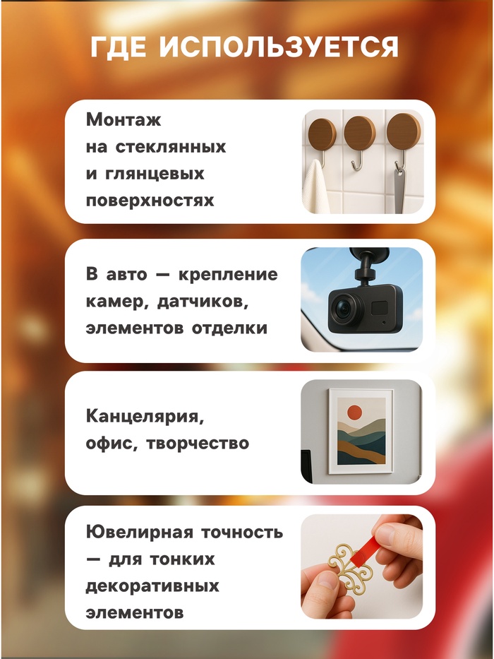 Автомобильный скотч TORSO предназначен для крепления декоративных элементов к кузову автомобиля. Может использоваться для крепления молдингов, спойлеров, накладок на дверь, обвесов, дефлекторов, эмблем, букв и т.п. Монтажная клейкая лента с мягкой акриловой основой и акриловым клеевым слоем, который обеспечивает высокую начальную адгезию. Лента имеет защитный слой из силиконового полиэтилена.
