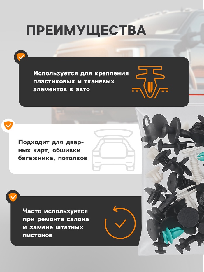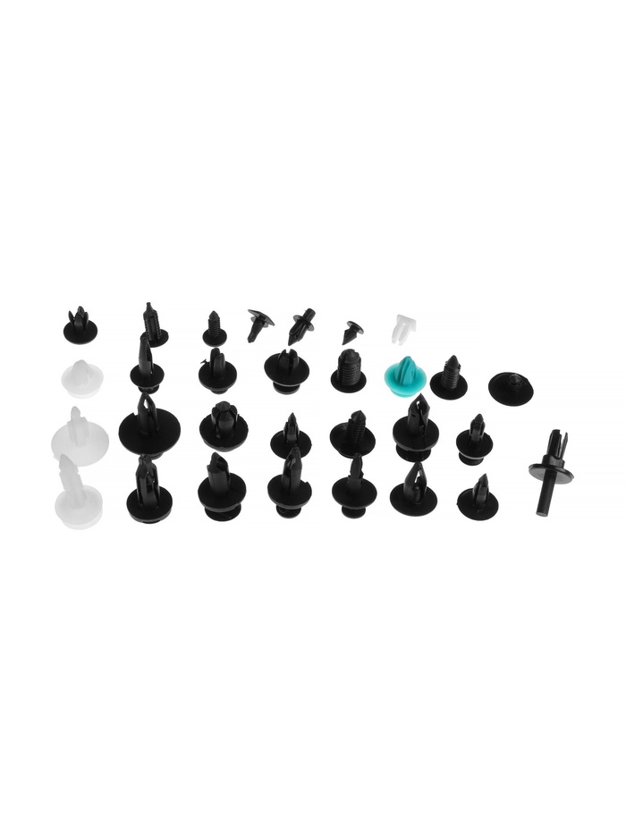 В транспортном средстве любая мелочь имеет значение. Не исключение крепежные клипсы и пистоны. На этих незаметных маленьких деталях из пластика держатся автомобильные молдинги, решетки радиаторов, бампера, обшивка салона, багажника, капота и дверей, декоративные элементы автоинтерьера, шумо- и теплоизоляция, уплотнители, порожки, коврики, облицовка околодверных стоек, подкрыльники, фары и многое другое. Учитывая важность этих деталей, Вы не можете оставить себя без такого набора!