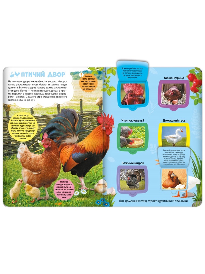 Каждое окошко в книге открывает ребёнку удивительные факты о жизни на ферме: как выглядят животные, чем они питаются и как живут. Реальные фотографии и интерактивные элементы делают процесс обучения живым и интересным. Малыш учится различать животных, запоминать их особенности и расширять кругозор. Это не только знакомит с окружающим миром, но и формирует любовь к исследованию.