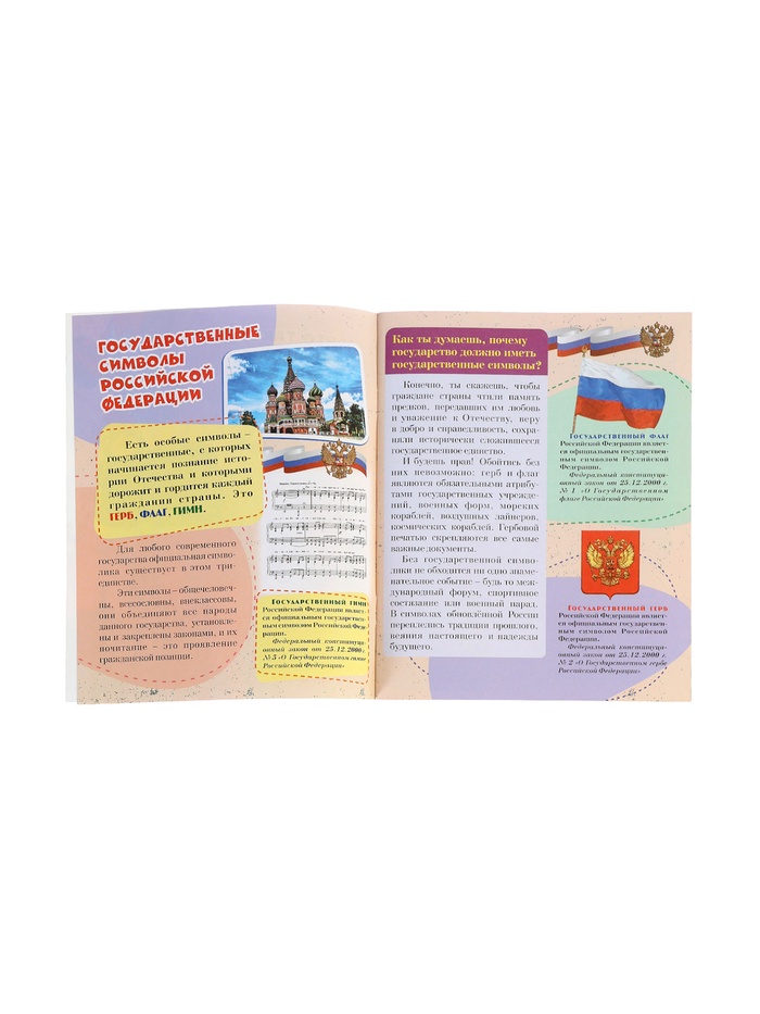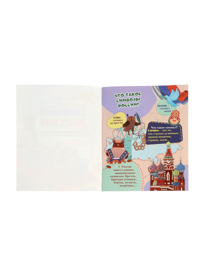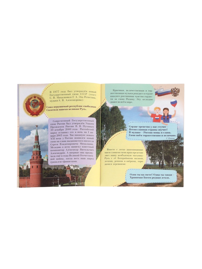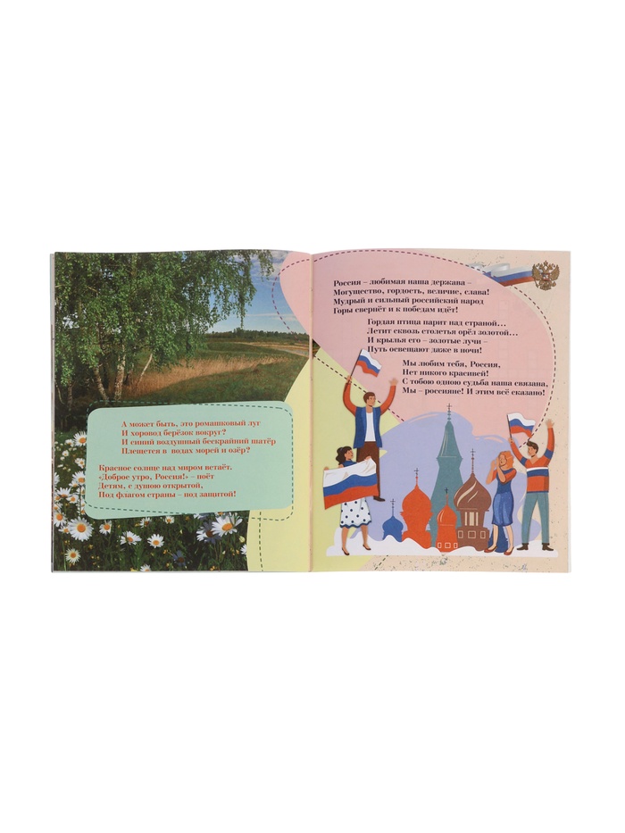 - 32 страницы с простыми и понятными рассказами, которые помогают детям узнать о гербе, флаге, гимне и других важных символах России.