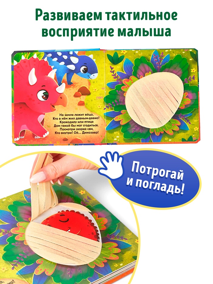 Тактильная книга для малышей «Динозаврики» станет прекрасным выбором для знакомства ребёнка с окружающим миром. Увлекательные стишки и яркие иллюстрации превращают процесс чтения в весёлое приключение, а семь тактильных вставок помогают развивать чувствительность пальчиков и исследовать текстуры.