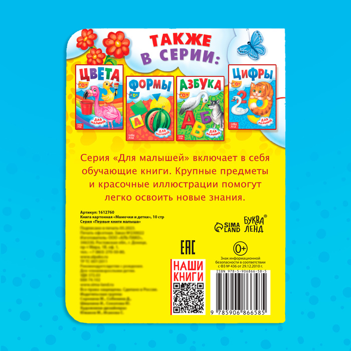 На каждой странице есть подпись и иллюстрация мамы и её малыша. Так кроха без труда запомнит названия и внешний вид животных, а яркие картинки сделают процесс обучения интересным и лёгким.