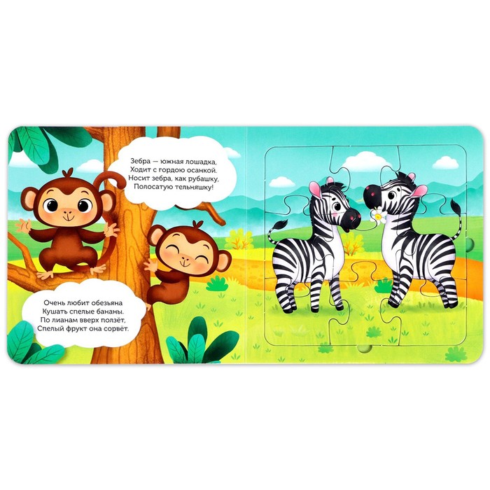 В этой чудной книге малыша ждут не только добрые животные и стихи, но и пазлы. Собирайте их вместе с малышом, чтобы запомнить всех зверей и узнать, где они обитают.
