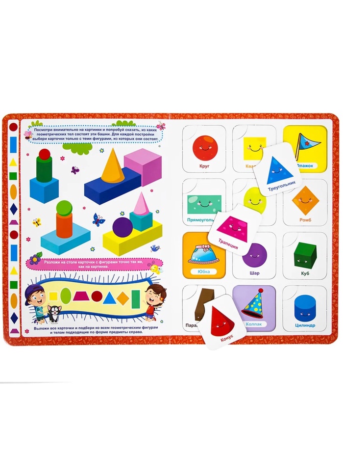 - 48 карточек помогают освоить основные цвета и формы, развивая логическое и ассоциативное мышление.