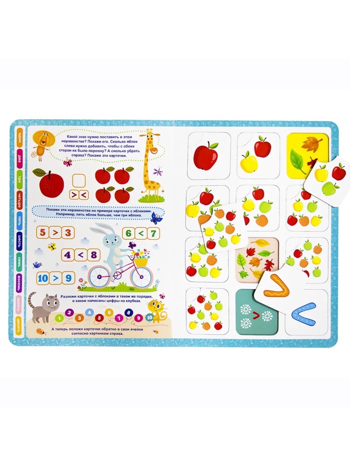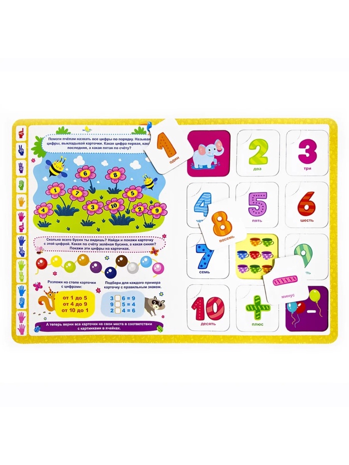 - 48 карточек помогают освоить цифры, счёт и базовые математические понятия через игру.