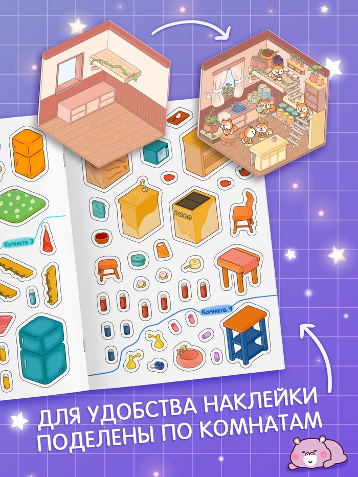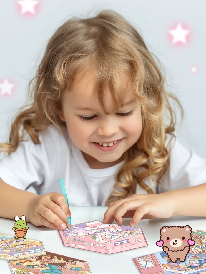 Ребёнок не просто играет — он проектирует, заботится, рассказывает истории. Кто живёт в этом доме? Что готовят на кухне? Где хранятся игрушки? Каждая деталь рождает новый сюжет, а наклейки легко переставляются без следа — так игра остаётся свежей день за днём.