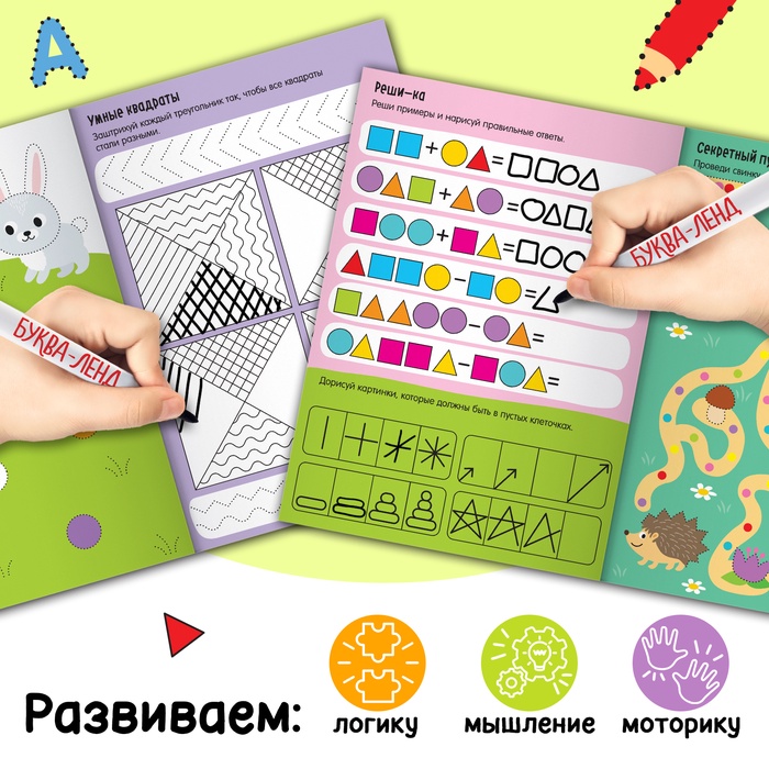 Книги с маркерами — это бесконечное удовольствие и развивающая игра в одном издании. Малыш может рисовать, обводить и выполнять увлекательные задания книжки, а затем стереть всё написанное с помощью колпачка-маркера и начать заново. Маркер на водной основе легко удаляется, и любимые задания можно выполнять снова и снова.