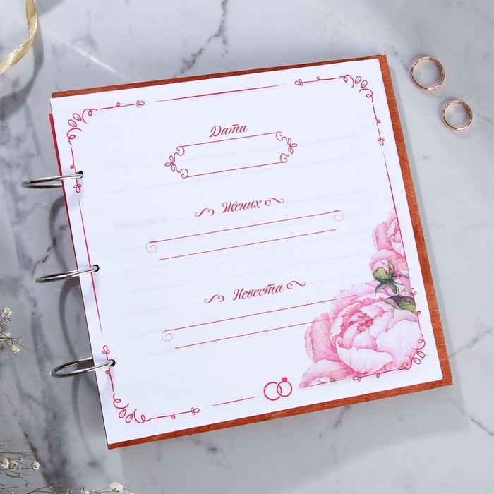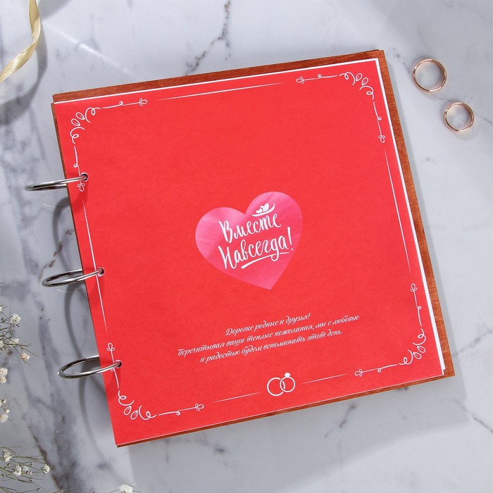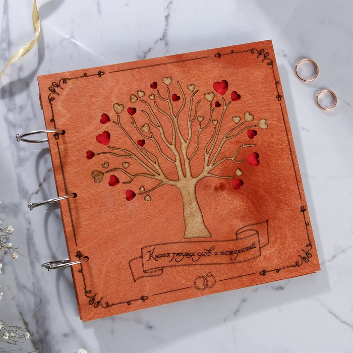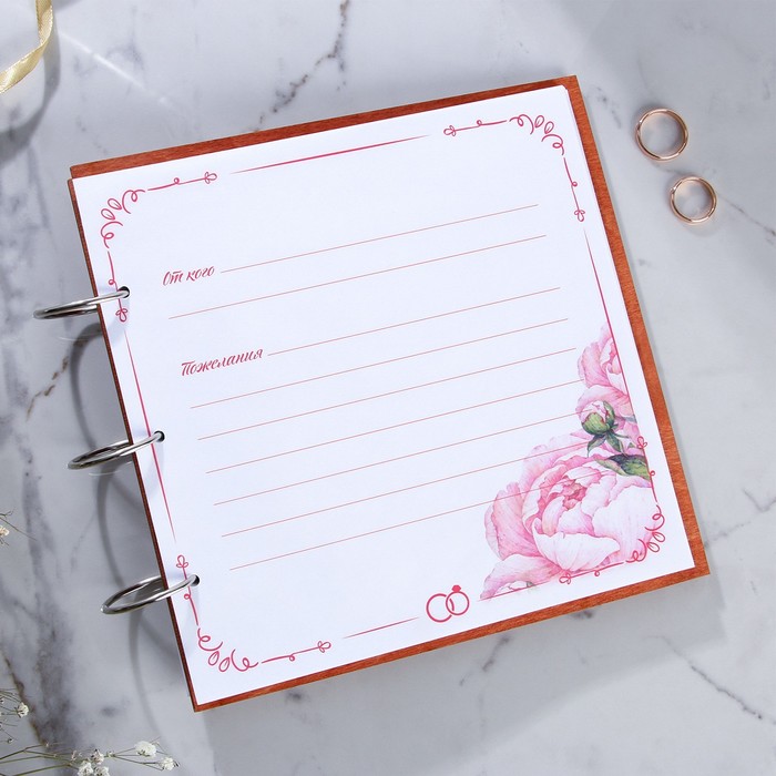 Гостевая книга с деревянной обложкой на кольцах. Записывать пожелания в эту книгу понравится всем гостям. А вам понравится то, что через много много лет вы сможете окунуться еще раз в атмосферу вашего праздника. Идеально для свадьбы в стиле бохо, рустик, минимализм, прованс. В книге 42 односторонних листа размером 20х20 см плотностью 80 гр., первый лист титульный, второй лист для молодоженов с указанием даты торжества и имён, последующие 40 листов для искренних пожеланий счастливой семейной жизни жениху и невесте.