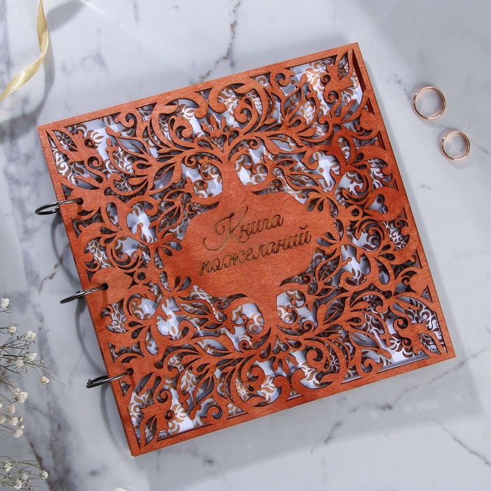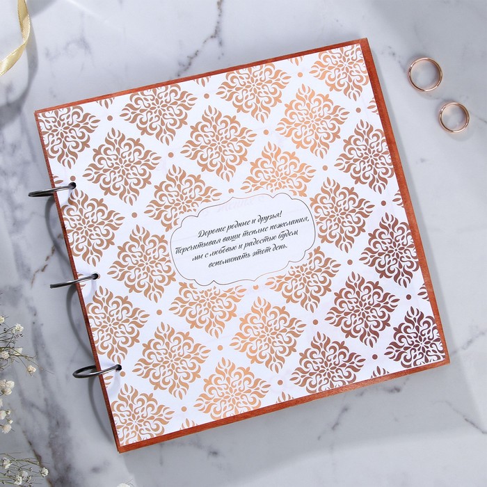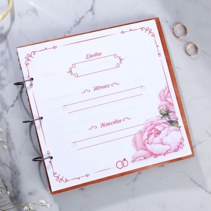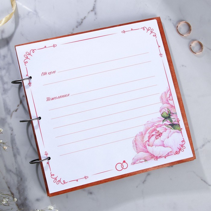 Гостевая книга с деревянной обложкой на кольцах. Записывать пожелания в эту книгу понравится всем гостям. А вам понравится то, что через много много лет вы сможете окунуться еще раз в атмосферу вашего праздника. Идеально для свадьбы в стиле бохо, рустик, минимализм, прованс. В книге 42 односторонних листа размером 20х20 см плотностью 80 гр., первый лист титульный, второй лист для молодоженов с указанием даты торжества и имён, последующие 40 листов для искренних пожеланий счастливой семейной жизни жениху и невесте.