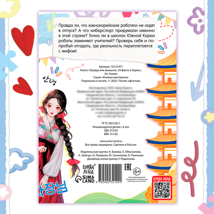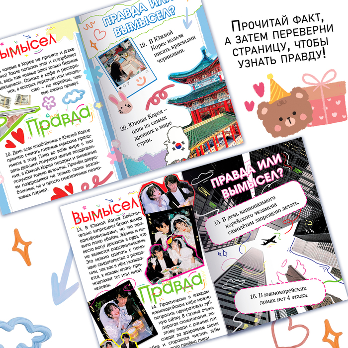 Книга «Правда или вымысел» позволит вам окунуться в культуру, историю и познакомит с обычаями Кореи. Внутри вы найдёте устоявшиеся мифы и правдивые факты об азиатской стране. С данной книгой вы сможете не только расширить свой кругозор, но и весело провести время с друзьями, просто устройте увлекательную викторину: задавайте вопрос и собирайте голоса за каждый вариант.