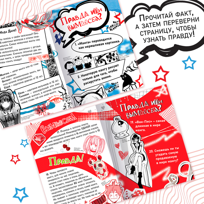 Книга «Правда или вымысел» позволит вам окунуться в культуру манги. Внутри вы найдёте 20 каверзных вопросов о мире манги и самых культовых работах. С данной книгой вы сможете не только расширить свой кругозор, но и весело провести время с друзьями, просто устройте увлекательную викторину: задавайте вопрос и собирайте голоса за каждый вариант.