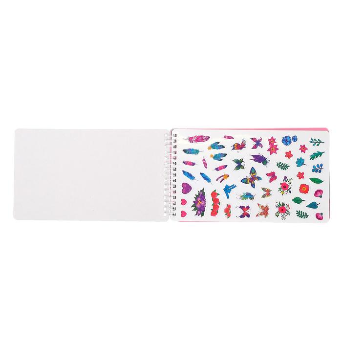 В альбоме есть 4 листа с трафаретами, 30 листов с моделями для раскрашивания, 2 листа с наклейками, а также 5 цветных листов для аппликаций.
