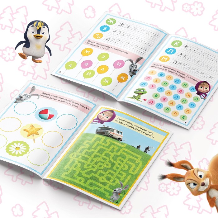 Яркие иллюстрации с любимыми героями из мультфильма «Маша и Медведь» сделают занятия веселее и интереснее.