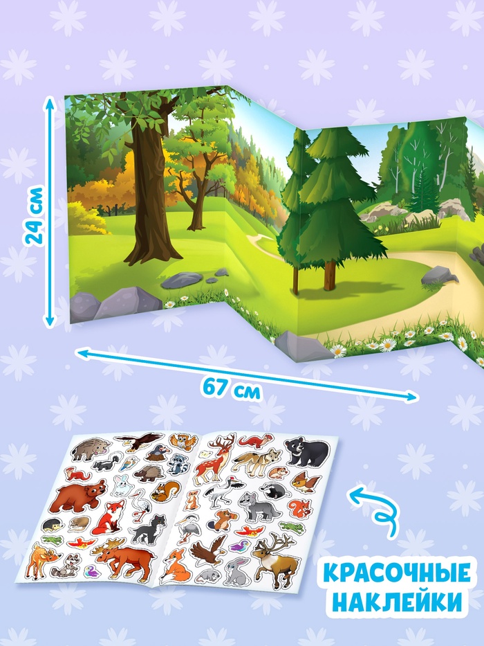 - Издание двустороннее: на одной стороне есть мини-рассказы о персонажах, на другой — красочное поле для наклеек.