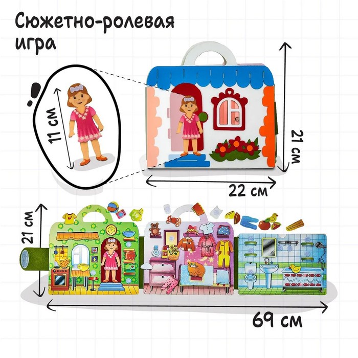 Фетровый игровой набор «Кукольный домик» — это компактный и многофункциональный домик для девочек, который станет идеальным спутником в развивающих играх. В набор входят 38 элементов, включая куклу высотой 11 см, которые легко крепятся на липучках. Домик разделён на 4 комнаты: кухню, спальню, ванную и прихожую со шкафом, что позволяет ребёнку погрузиться в мир ролевых игр и творчества. Удобная сумка-переноска с карманом для аксессуаров делает набор мобильным и практичным для путешествий.
