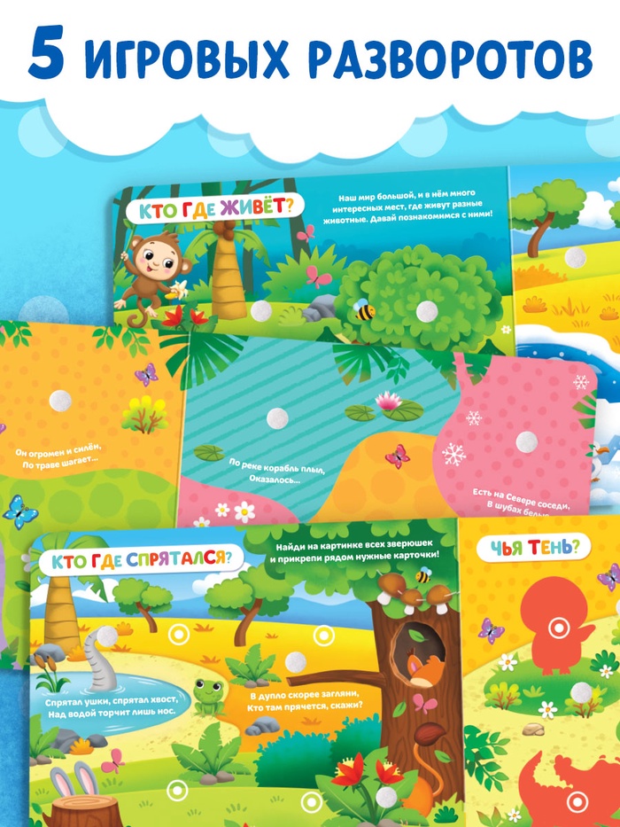 Ваш малыш обожает животных? Тогда эта яркая книга точно понравится крохе. Играя с липучками, ребёнок узнает, где обитают разные виды зверушек, и весело проведёт время.