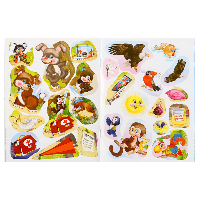 - Развивающие задания с наклейками, где нужно найти недостающие детали и вклеить их в книгу.