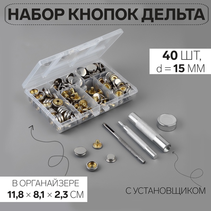 Кнопки установочные, Дельта, d = 15 мм, 40 шт, с установщиком, в органайзере, 11,8 × 8,1 × 2,3 см, цвет серебряный