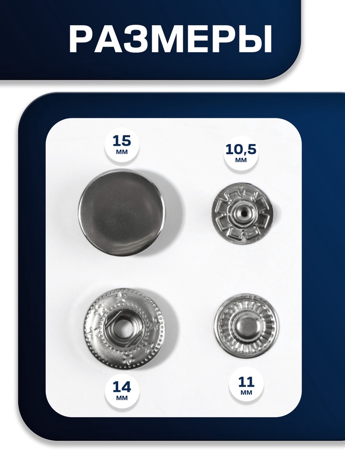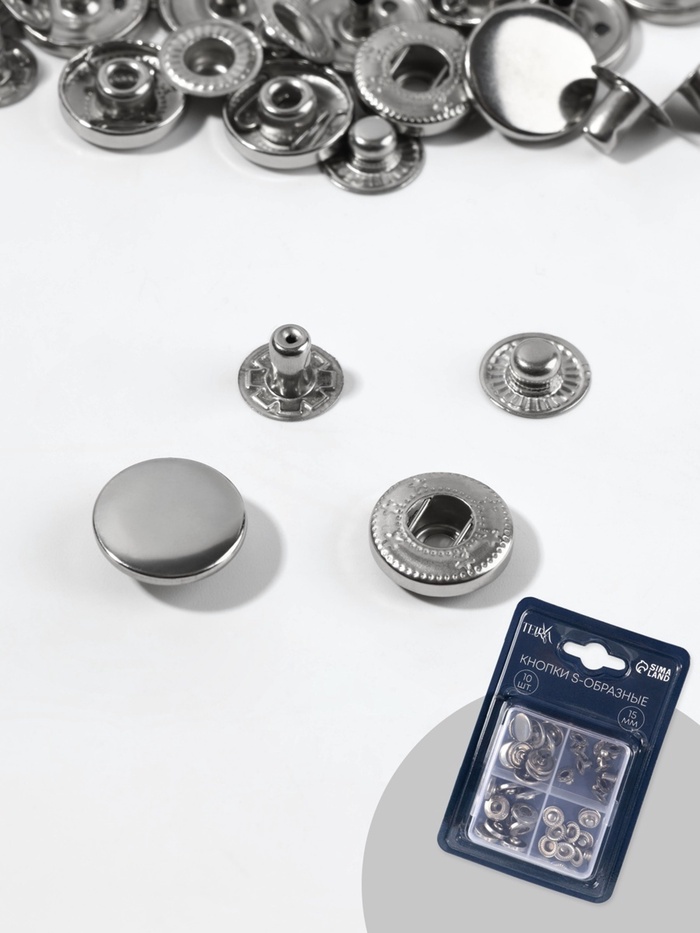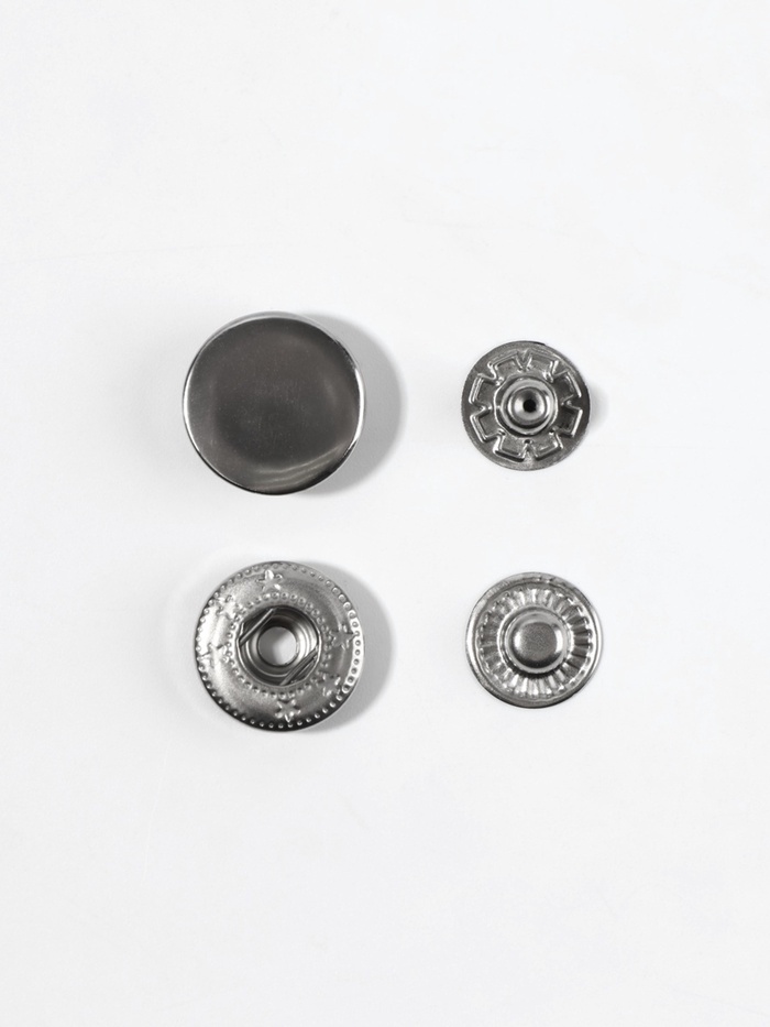 Металлические установочные кнопки S-типа диаметром 15 мм — это практичное решение для прочного соединения тканевых слоев. Серебристый цвет и стойкость к коррозии делают их подходящими как для повседневного использования, так и для профессиональной работы.