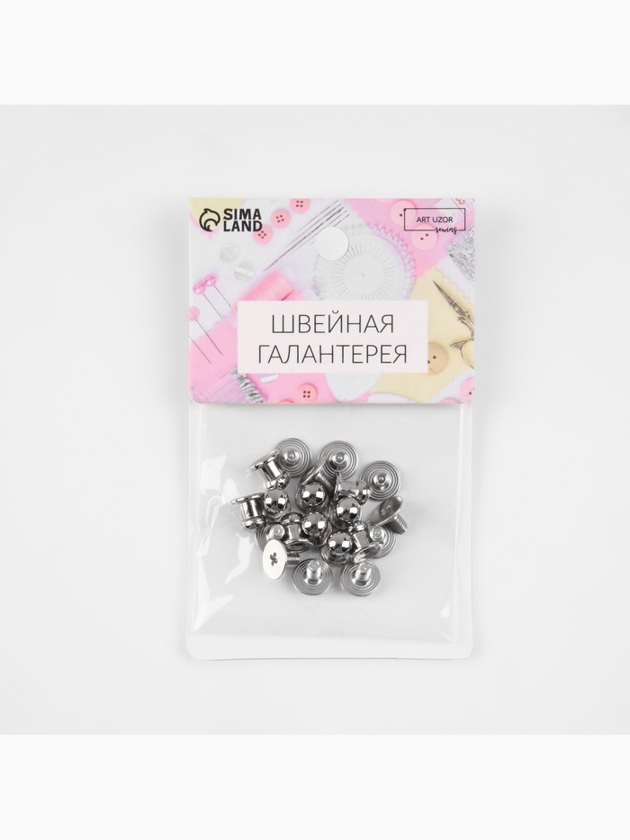 В наборе 10 штук серебряного цвета. Диаметр шляпки 5 мм; диаметр основания 6 мм; высота 8 мм.