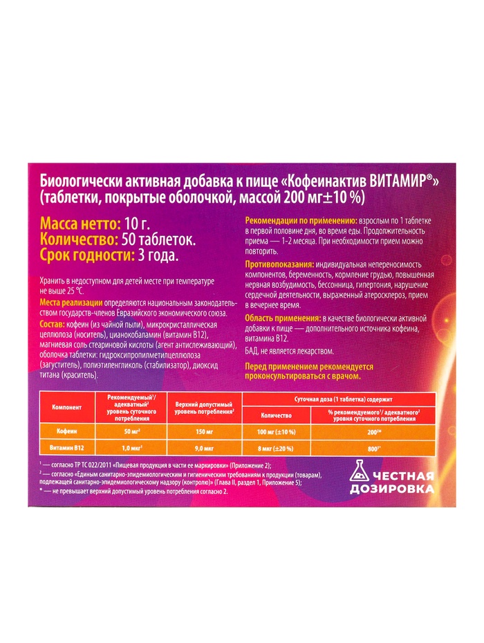 - Оптимальная дозировка. 200 мг кофеина в таблетке обеспечивает выраженный стимулирующий эффект без перегрузки организма.
