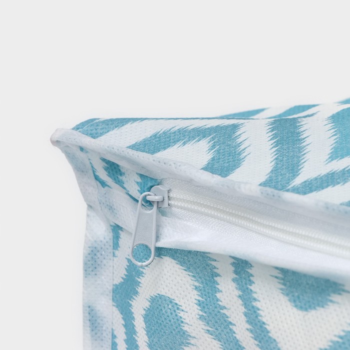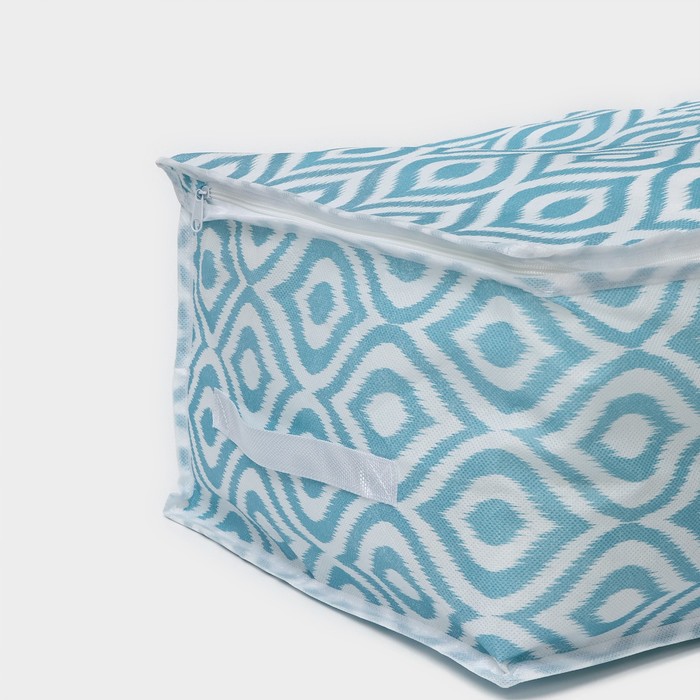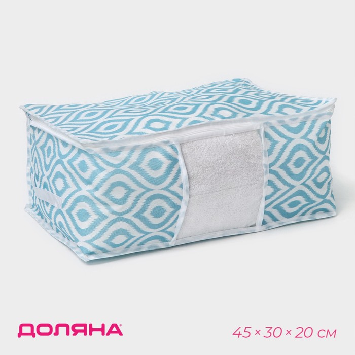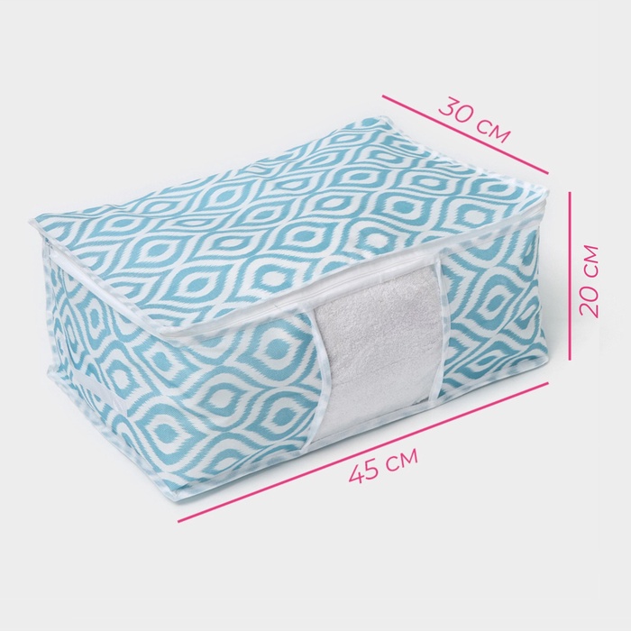 Изготовленный из качественного флизелина, кофр привлекает внимание своим ярким бирюзовым цветом и оригинальными узорами, которые добавят нотку свежести в интерьер. Прозрачное ПВХ-окно позволяет легко увидеть содержимое, что исключает необходимость в постоянных поисках нужных вещей.