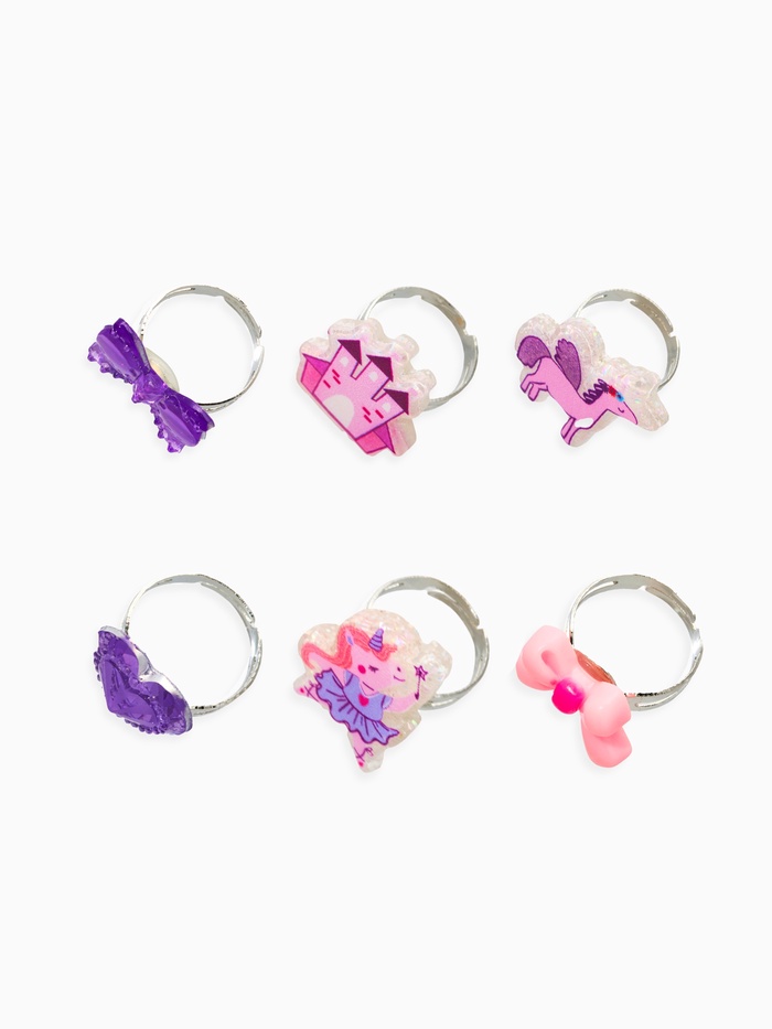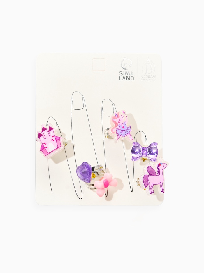 Позвольте девочке выразить свою индивидуальность! Набор из 6 детских колец с тематикой замок и пегас – это комплект украшений, созданных для юных любительниц сказок и фантазий. Каждое кольцо украшено изображением волшебных элементов и выполнено из прочных материалов для долговечной носки.