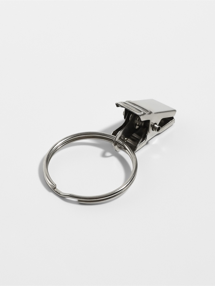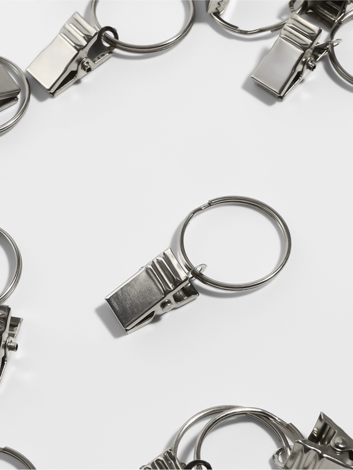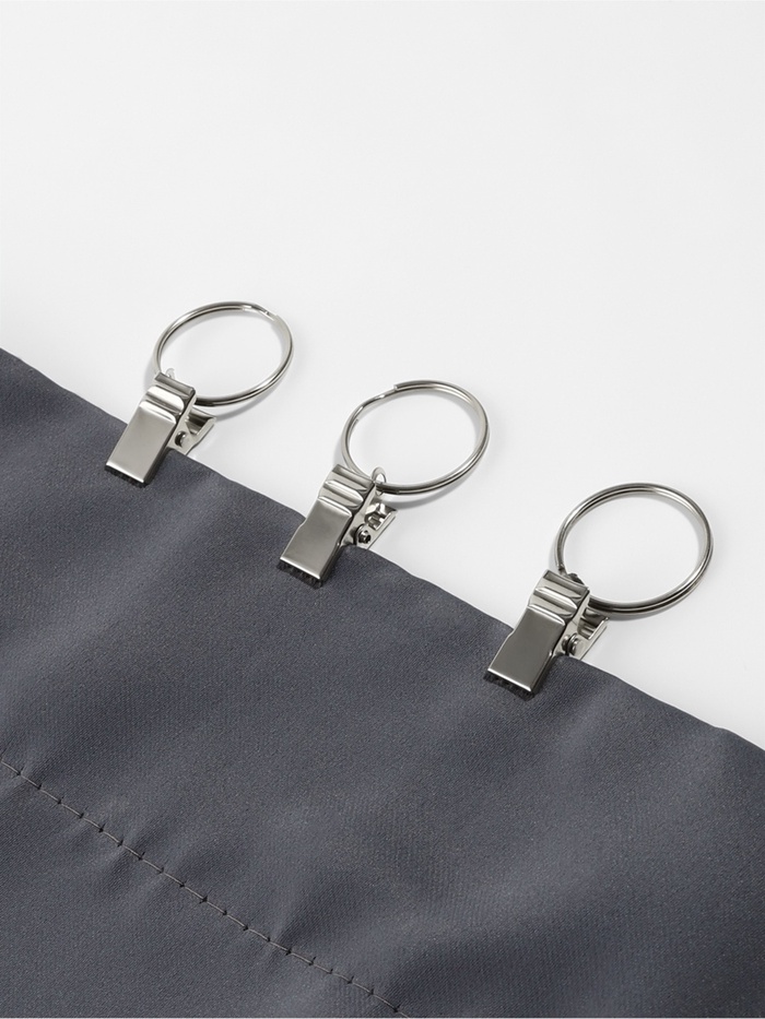 Чтобы надёжно прикрепить шторы, воспользуйтесь кольцом с зажимом. Конструкция прочно сцепит ткань, но не повредит её, выдержит даже тяжёлый текстиль и останется незаметным. Поместите изделие на карниз, и шторы будут плавно скользить по балке.