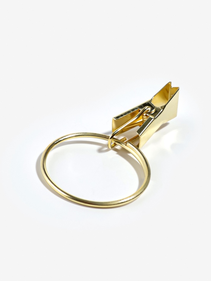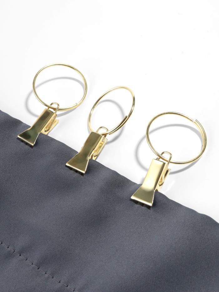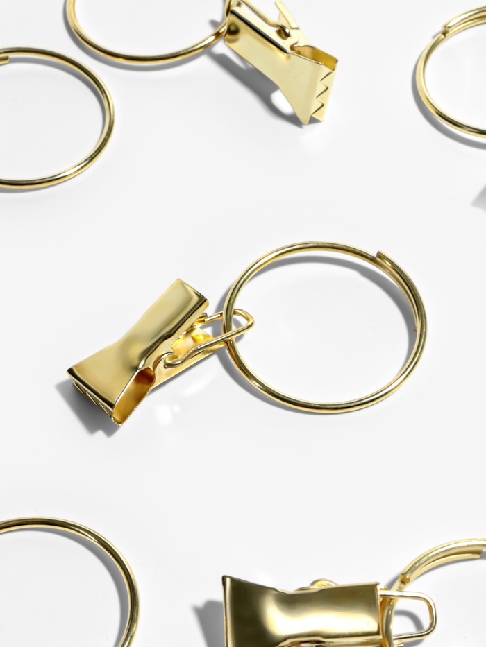 Чтобы надёжно прикрепить шторы, воспользуйтесь кольцом с зажимом. Конструкция прочно сцепит ткань, но не повредит её, выдержит даже тяжёлый текстиль и останется незаметным. Поместите изделие на карниз, и шторы будут плавно скользить по балке.