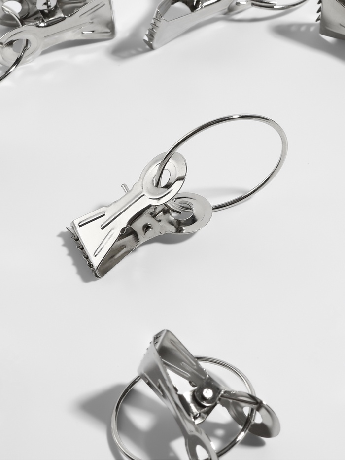 Чтобы надёжно прикрепить шторы, воспользуйтесь кольцом с зажимом. Конструкция прочно сцепит ткань, но не повредит её, выдержит даже тяжёлый текстиль и останется незаметным. Поместите изделие на карниз, и шторы будут плавно скользить по балке.