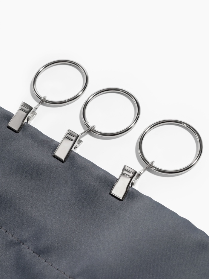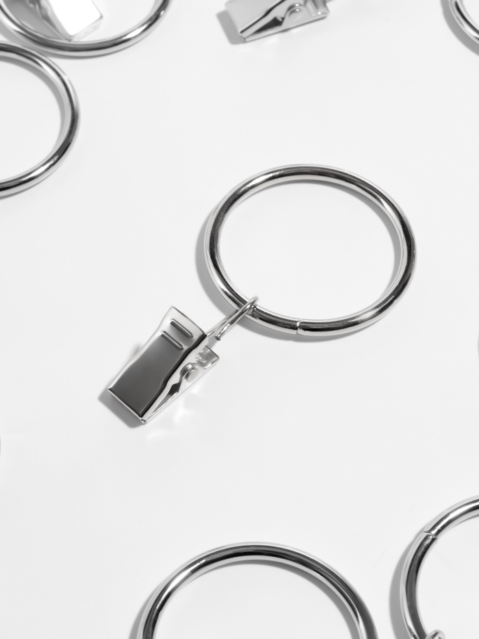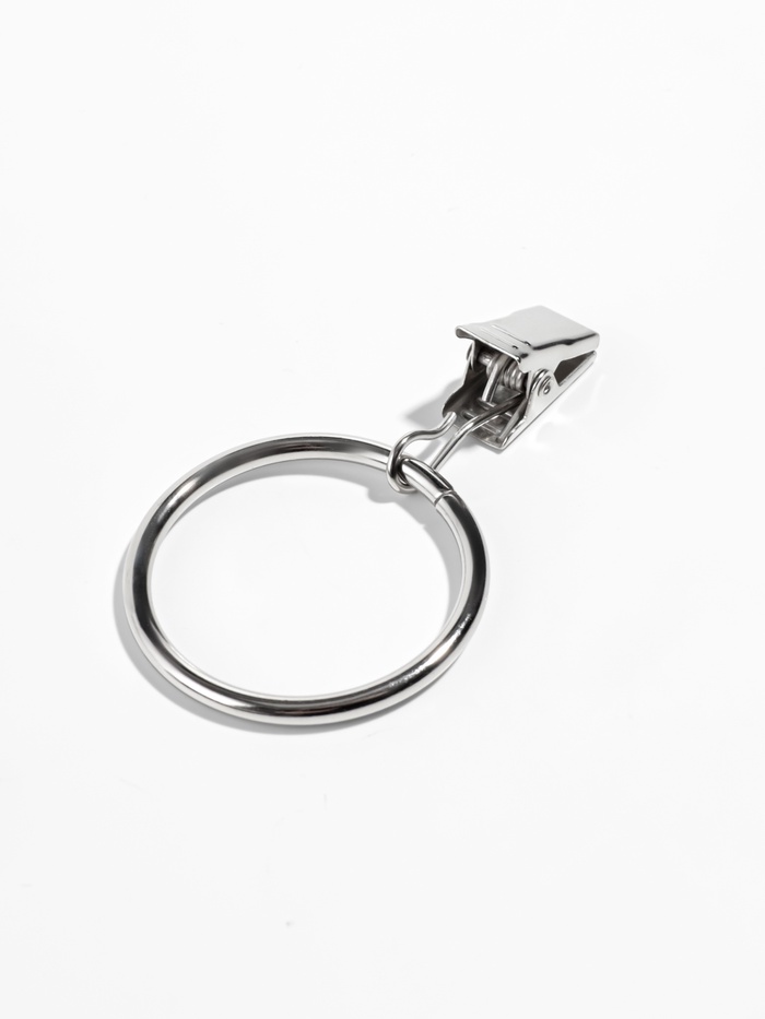 Чтобы надёжно прикрепить шторы, воспользуйтесь кольцом с зажимом. Конструкция прочно сцепит ткань, но не повредит её, выдержит даже тяжёлый текстиль и останется незаметным. Поместите изделие на карниз, и шторы будут плавно скользить по балке.
