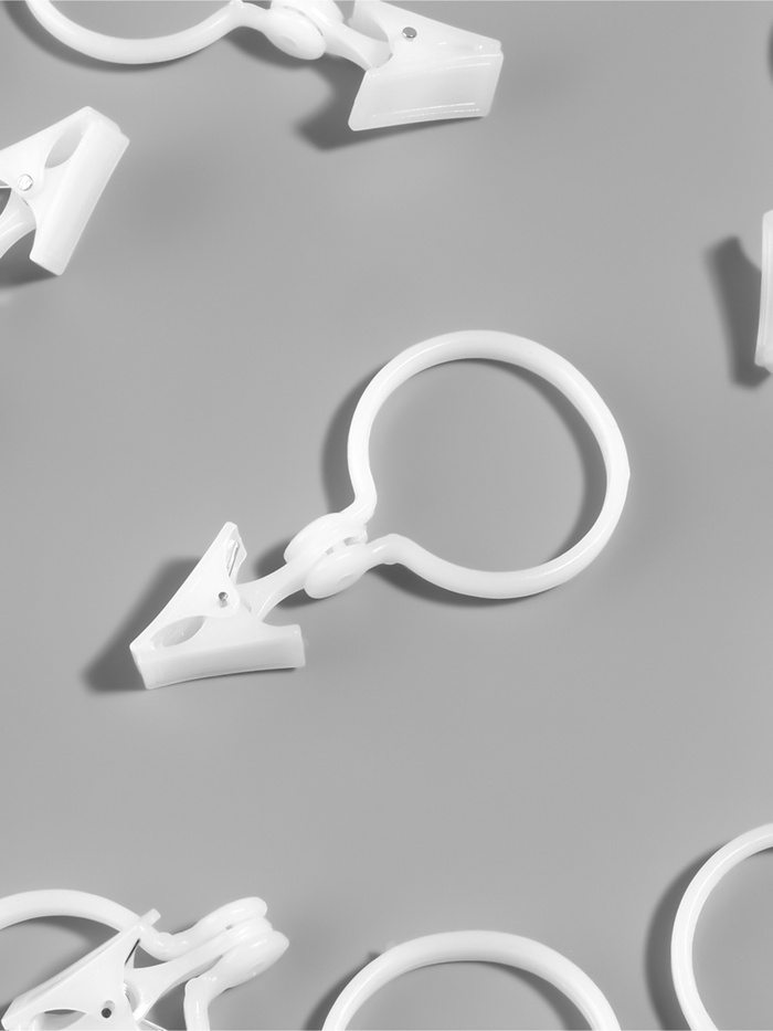 Эти кольца экономят время при монтаже и обеспечивают плотное прилегание штор к карнизу. Защёлкивающийся механизм позволяет быстро снимать и вешать занавески, а белый цвет делает их незаметными на фоне потолка или стены. Подходят как для дома, так и для временных установок в офисах или студиях.