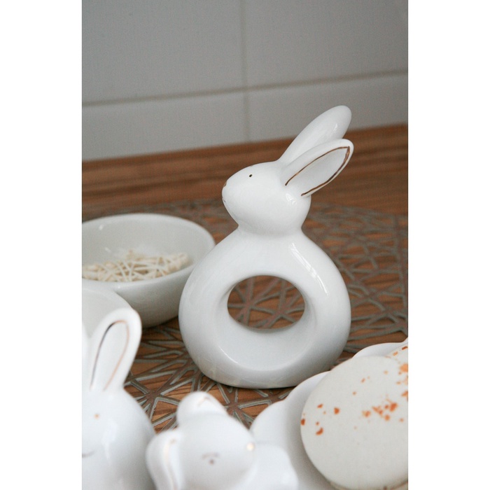 Кольцо для салфеток «Зайка в золотом» — миниатюрная керамическая фигурка, которая добавляет пасхальному столу сдержанную праздничность. Белая основа и лёгкие золотые акценты создают ощущение уюта без вычурности, а высота в 11,5 см делает его заметным даже среди множества деталей сервировки.