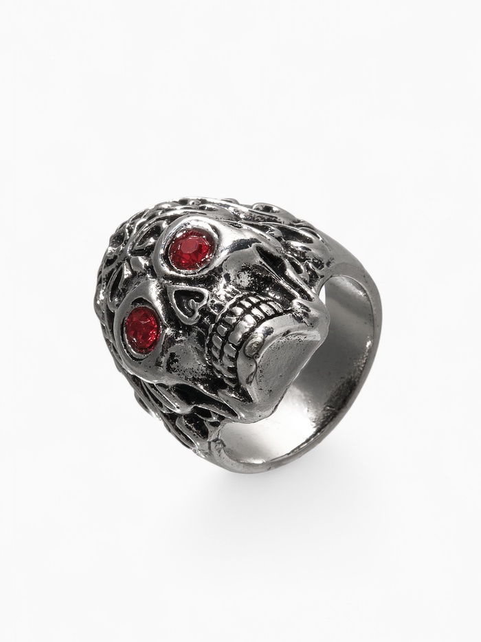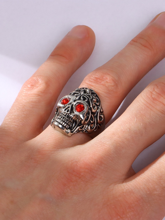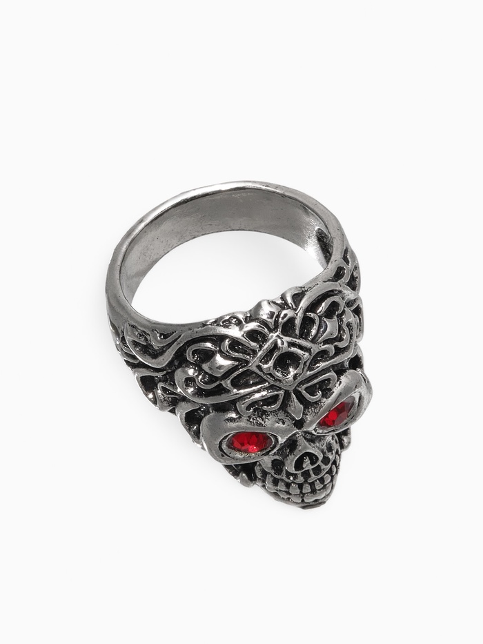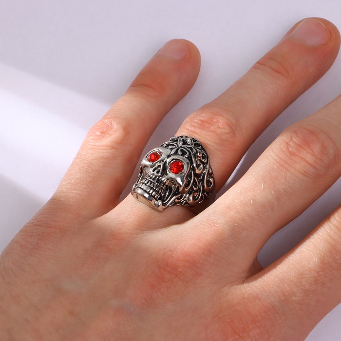 Череп, как символ силы и независимости, делает это кольцо не только стильным, но и значимым. Яркие красные стеклянные вставки в глазах придают ему особую выразительность, а чернёное серебро добавляет брутальности и элегантности.