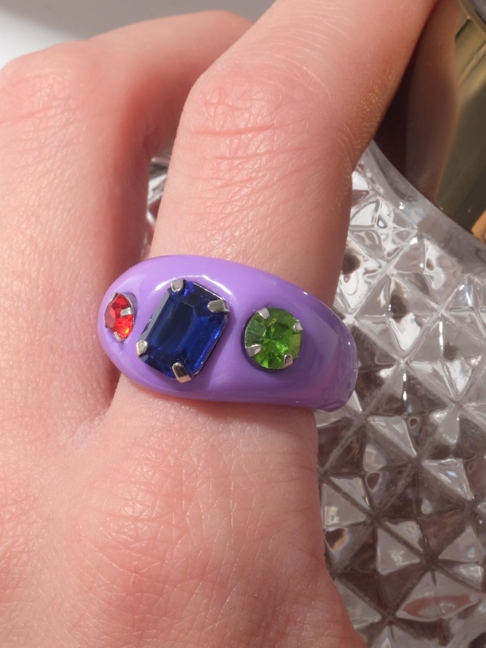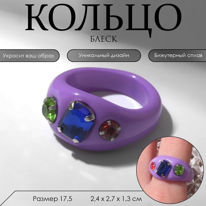 - Стильный и яркий дизайн: фиолетовый цвет и разноцветная вставка придают кольцу привлекательность, делая его настоящим украшением для любой женщины.