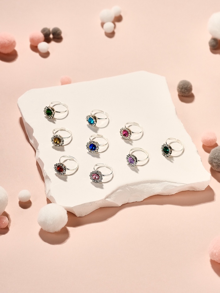 Изысканное детское кольцо с металлическим основанием и серебристой фурнитурой воплощает лёгкость и свежесть цветочного мотива. Микс ярких оттенков и блеск страз создают живую игру света, придавая украшению выразительность и утончённость, идеально подходящую для юных модниц.