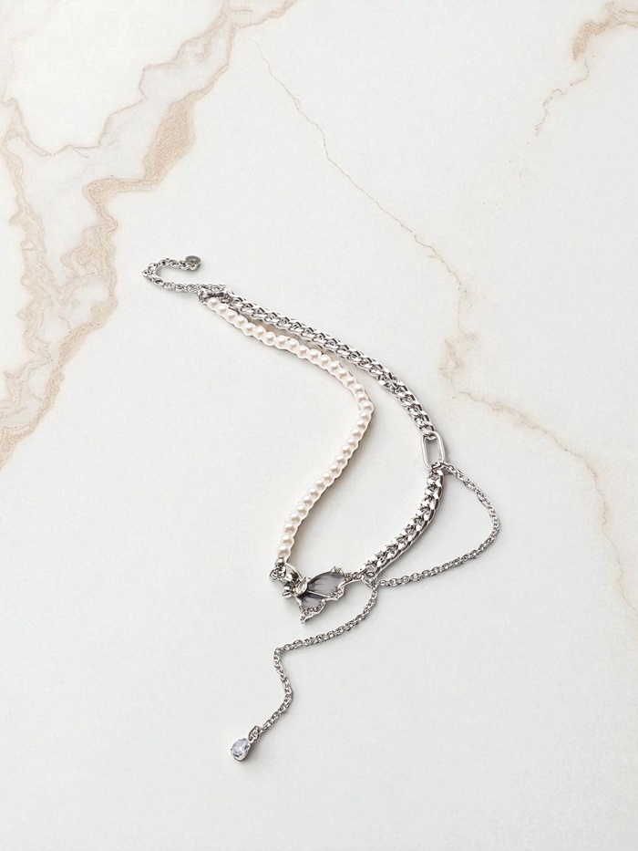 - Элегантность и шарм: одна нить жемчужин лежит поверх нежной серебряной цепочки, придавая колье многослойность и глубину.