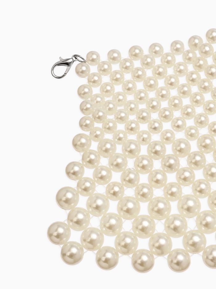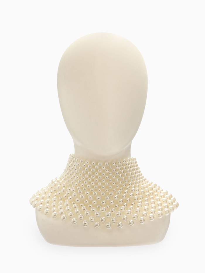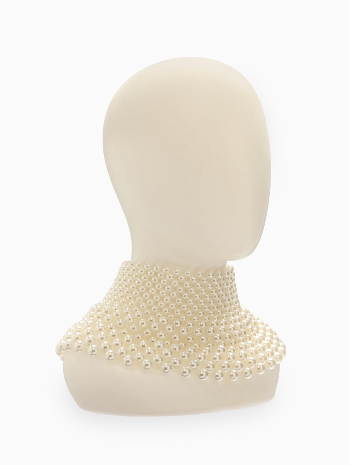 Колье создано из мелких и средних жемчужин, расположенных на красивой пластиковой основе, покрытой серебром. Размер каждой жемчужины варьируется от 8 до 12 миллиметров, что придает украшению дополнительное богатство и разнообразит игру света. Совокупная длина изделия равна 28 сантиметрам, создавая близкое к шее расположение, подчеркивающее линию подбородка и утонченность шеи.