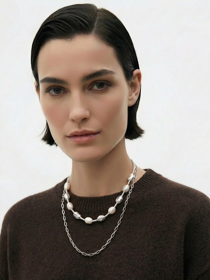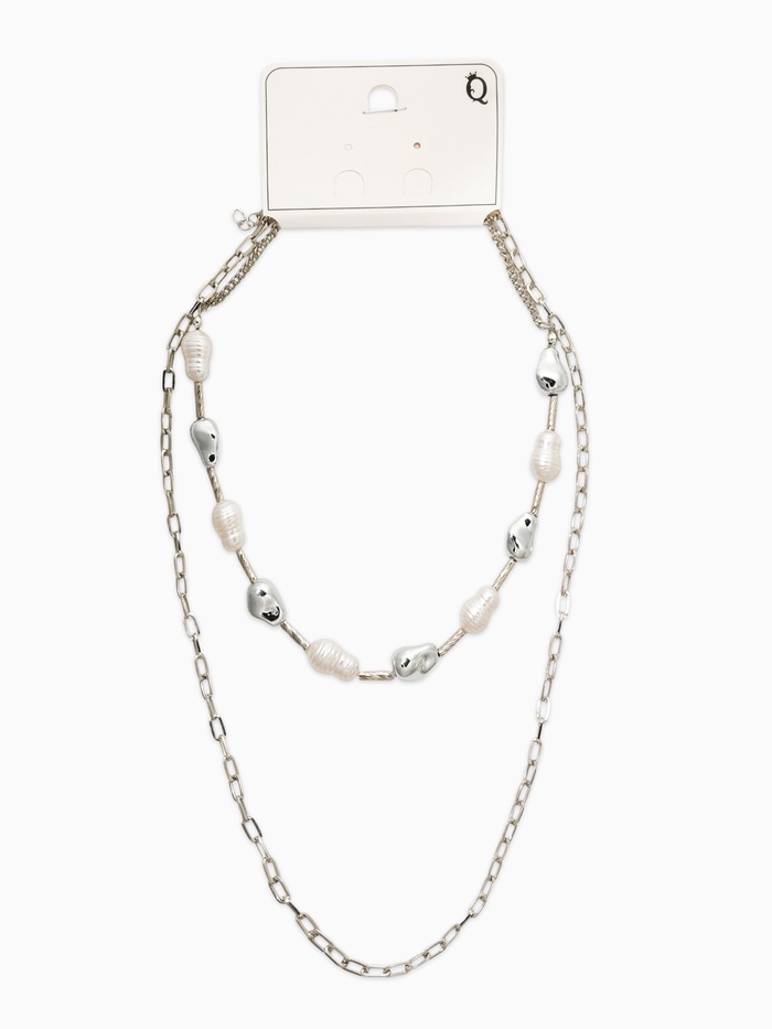 Колье "Жемчуг" борокко, цепь, удлиненное, 2 яруса, цвет белый в серебре