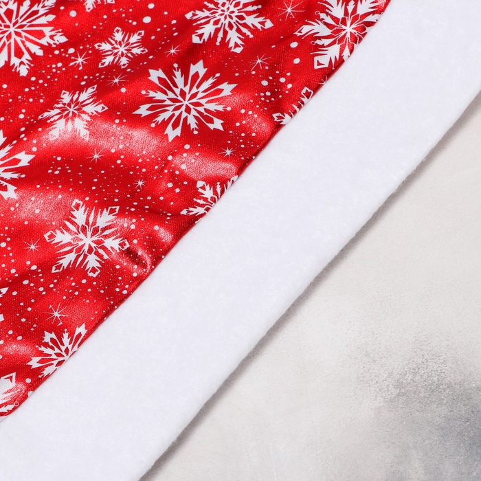 Новогодний текстильный колпак в красном цвете украшен белыми снежинками, создавая праздничное настроение и ассоциируясь с образом Деда Мороза. Размер 28×40 см делает аксессуар удобным для праздничных мероприятий и фотосессий.
