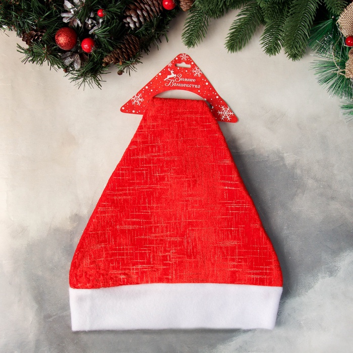 Текстильный новогодний колпак с красным фоном и праздничными персонажами — простой и яркий аксессуар для создания атмосферы зимнего торжества. Образ с Дедом Морозом, гномом, эльфом и клоуном помогает добавить веселья и уюта в праздничный наряд.