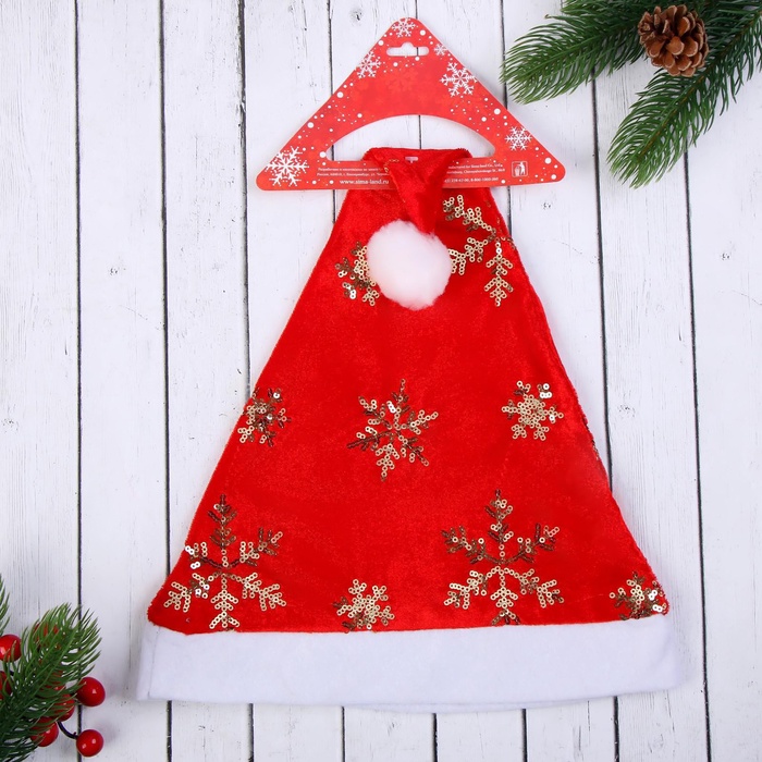 Красный текстильный колпак с золотистыми снежинками добавит изящества в новогодний образ и создаст атмосферу праздника. Размер 28×36 см обеспечивает комфорт при ношении во время зимних торжеств и фотосессий.