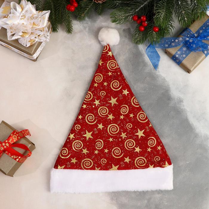 Новогодний красный колпак с ярким узором в виде звезд создаёт праздничное настроение и привлекает внимание на любом мероприятии. Изображение Деда Мороза подчёркивает традиционную тематику зимних праздников, а удобный размер обеспечивает комфорт при ношении.