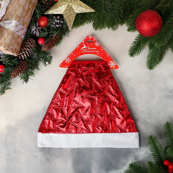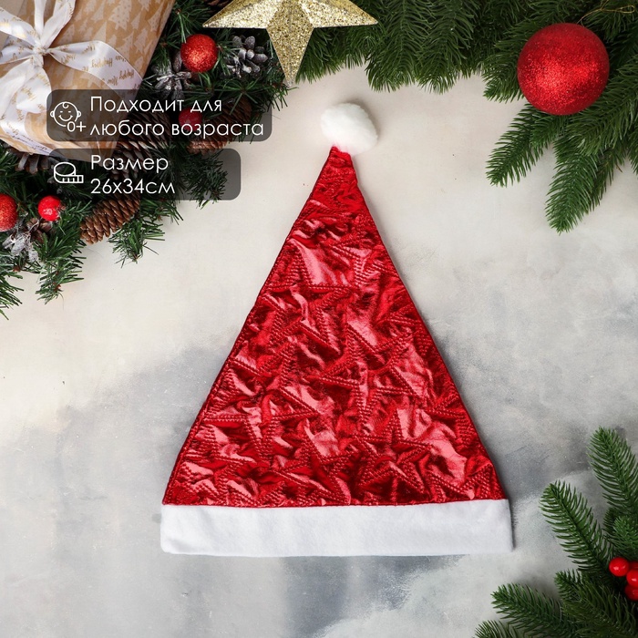 Красный текстильный колпак с узором из звёзд создаёт праздничный образ и подчёркивает новогоднюю атмосферу. Размер 26×34 см подходит для большинства взрослых и подростков, обеспечивая удобство и яркость на зимних праздниках.