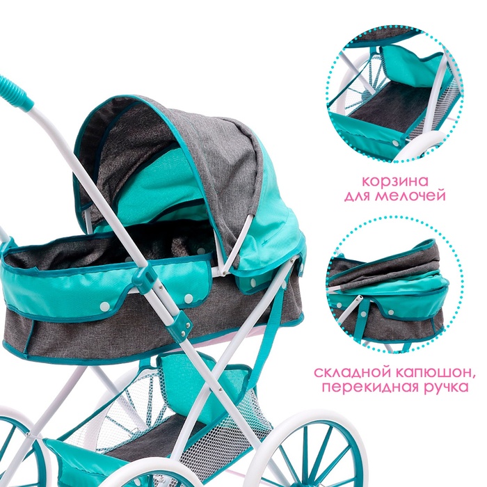 - Вместительная корзина для мелочей позволит взять с собой все необходимые аксессуары для куклы, а складной капюшон защитит от солнца и ветра.