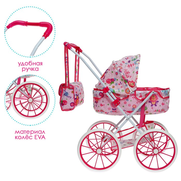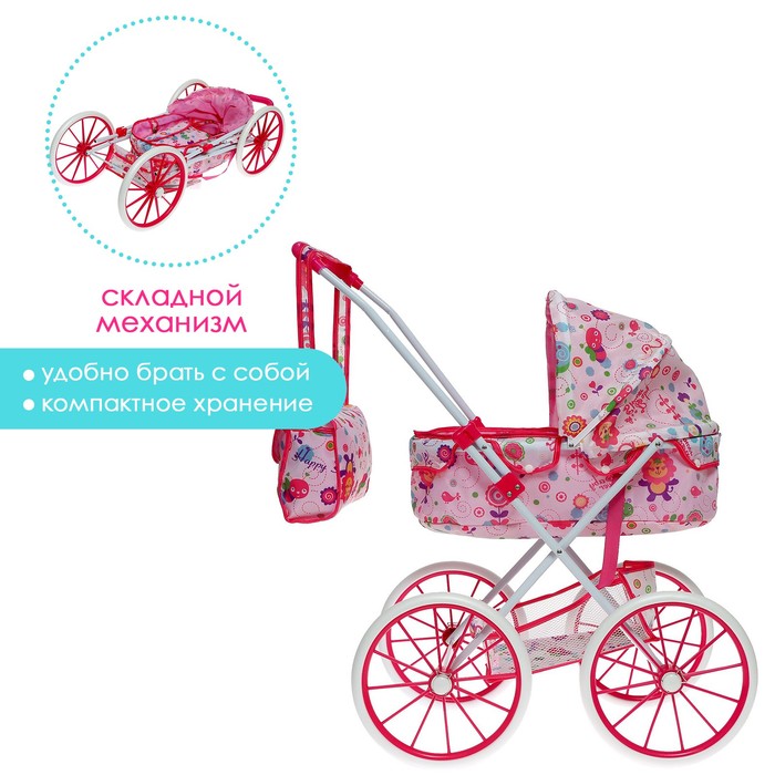 - Вместительная корзина и сумка для хранения мелочей — можно сложить бутылочку для куклы, игрушки или другие аксессуары для прогулки.