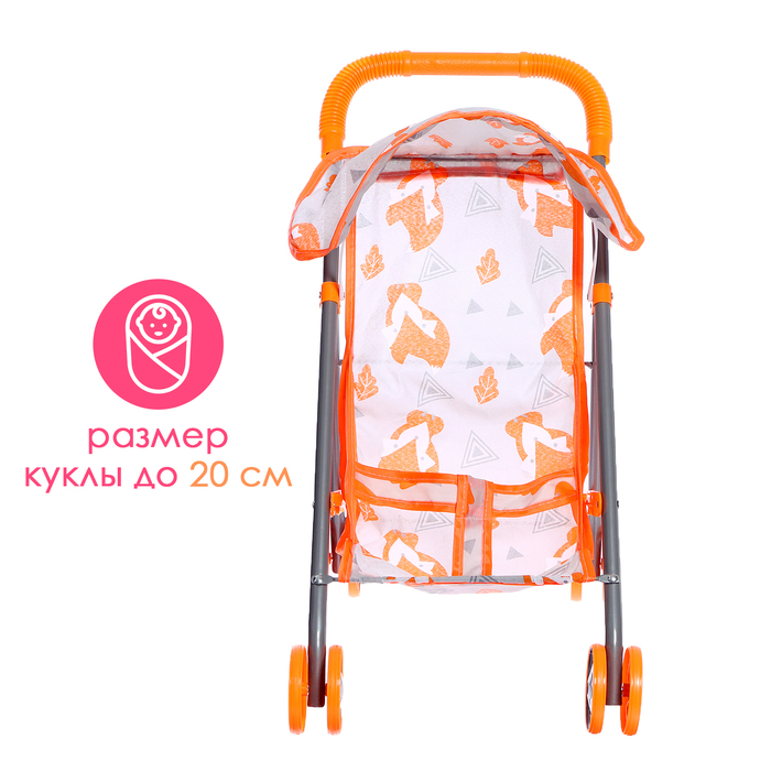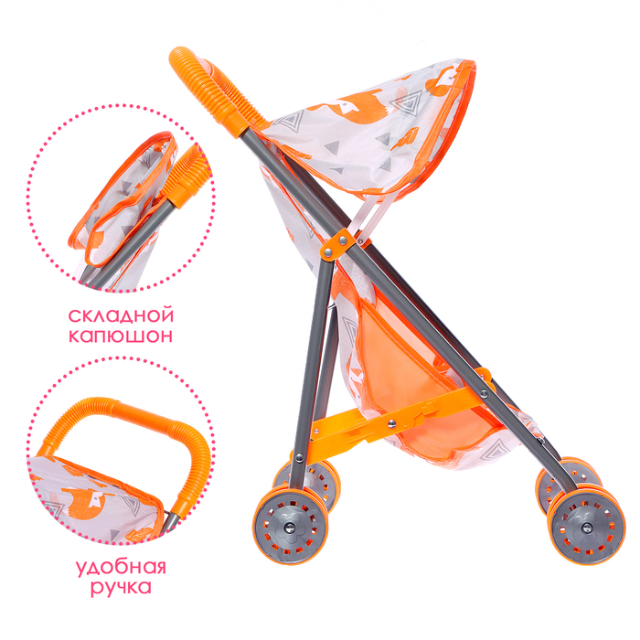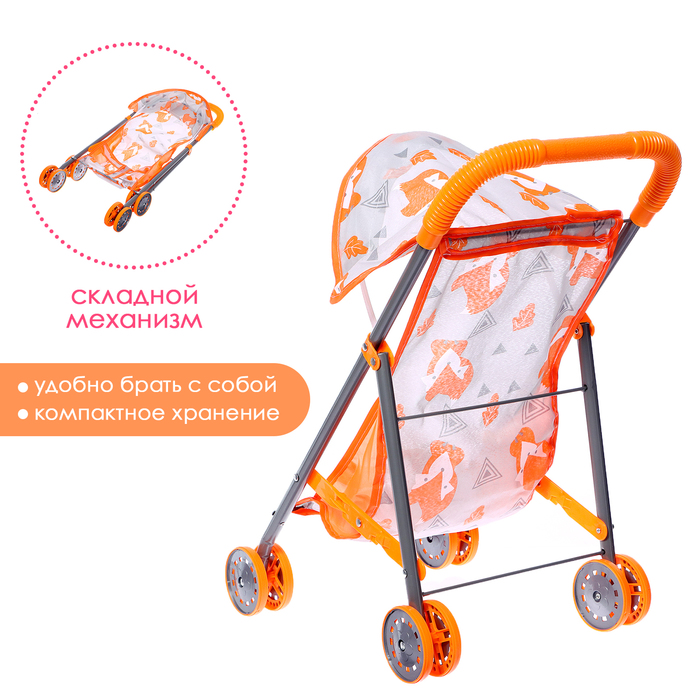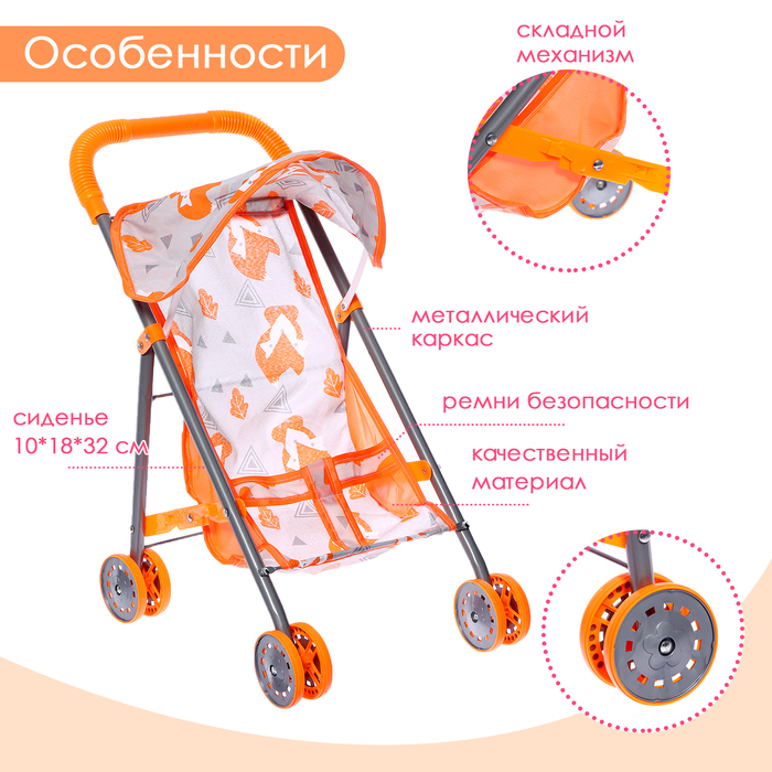 Летняя прогулочная коляска для кукол с ярким оранжевым дизайном привнесет в игры вашего ребенка море радости и фантазий. Металлический каркас придает прочности конструкции, а компактные размеры делают её отличным выбором для малышей с ростом до 90 см.