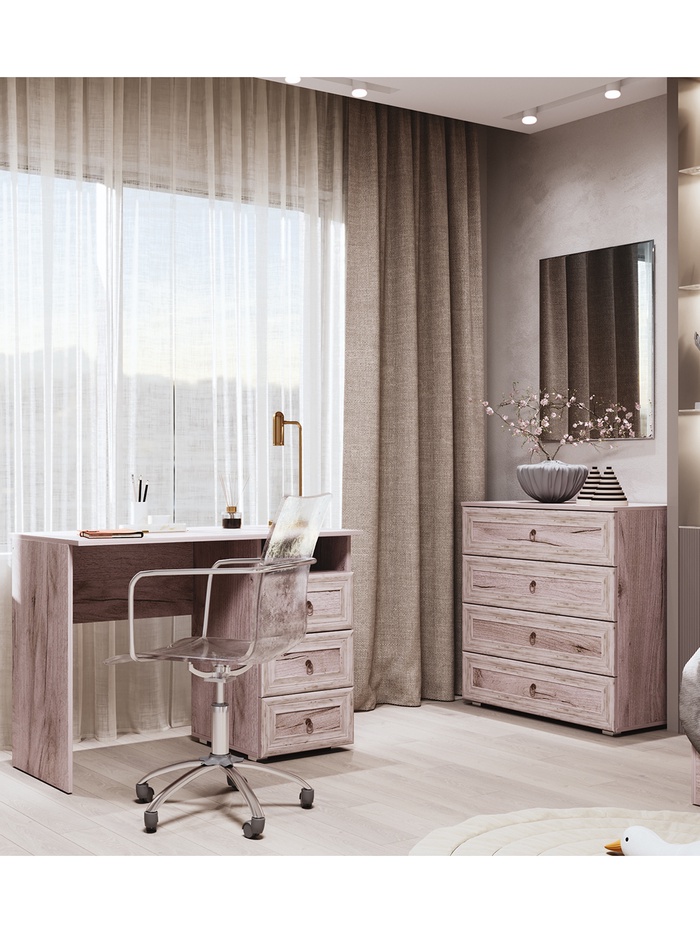 - Стильный акцент: благородный оттенок и декоративная фрезеровка делают комод не просто местом хранения, а самостоятельным декоративным элементом интерьера.