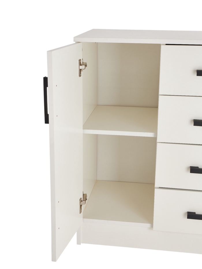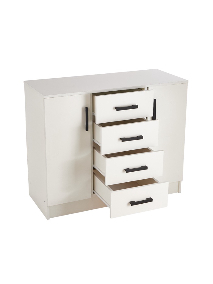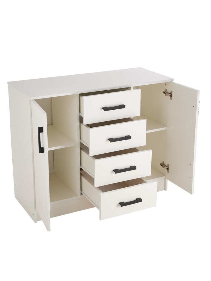 - Оборудован четырьмя выдвижными ящиками с роликовыми направляющими, что предоставляет удобное место для хранения мелких предметов, а также двумя дверцами с полками внутри для более крупных предметов.